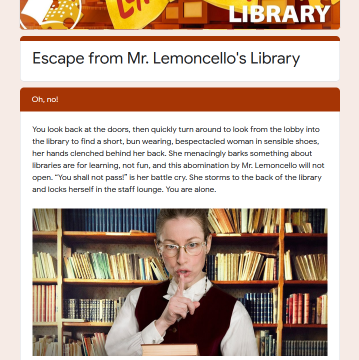 Built by the Children’s Staff of the Stow-Munroe Falls Public Library, it utilizes Google forms for its storytelling (this is the most common format I’ve noticed for library-created digital escape rooms). I appreciate that they also feature and highlight the book it is based on in the beginning as way of getting readers interested! It is pretty text-heavy but prompts the players to use the library’s website as part of solving puzzles! And it doesn’t take itself too seriously…