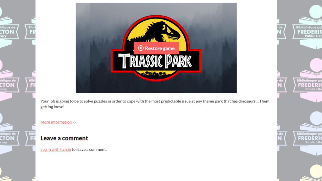The Frederiction Public Library librarian who built this game shared that they used the open-resource tool Twine to do so. It’s programming a story without code, at least on the most basic level. I like the atmosphere the styling provides to the experience.